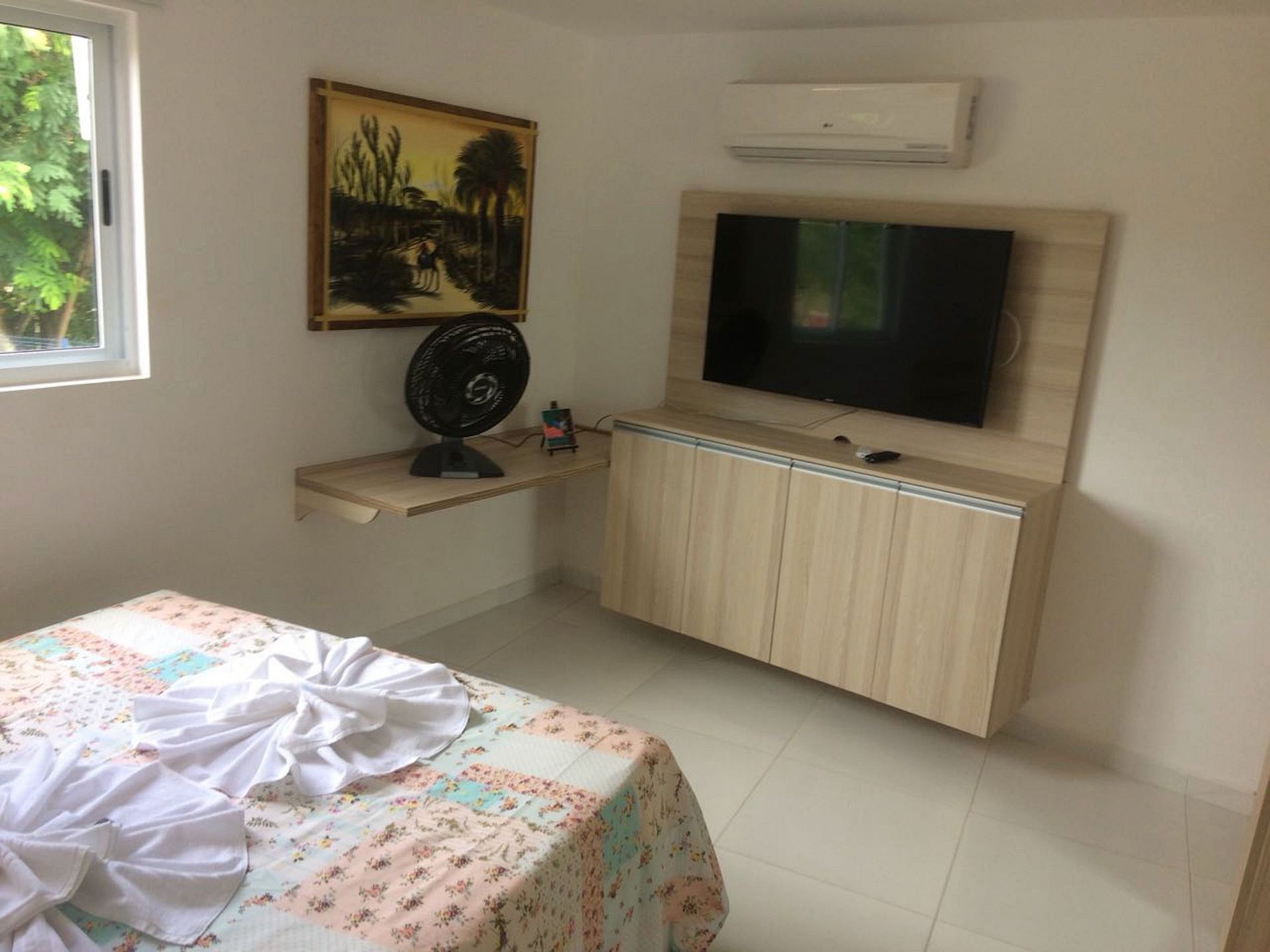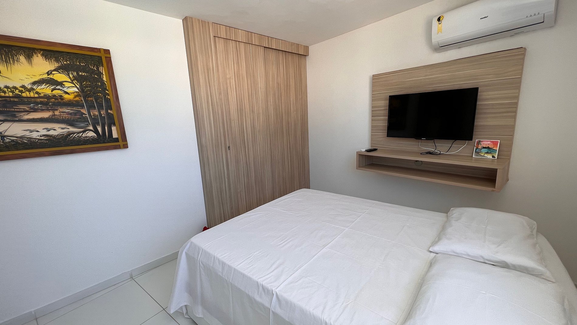 - 01 quarto com: ar-condicionado, 01 cama de casal, um armário e uma TV