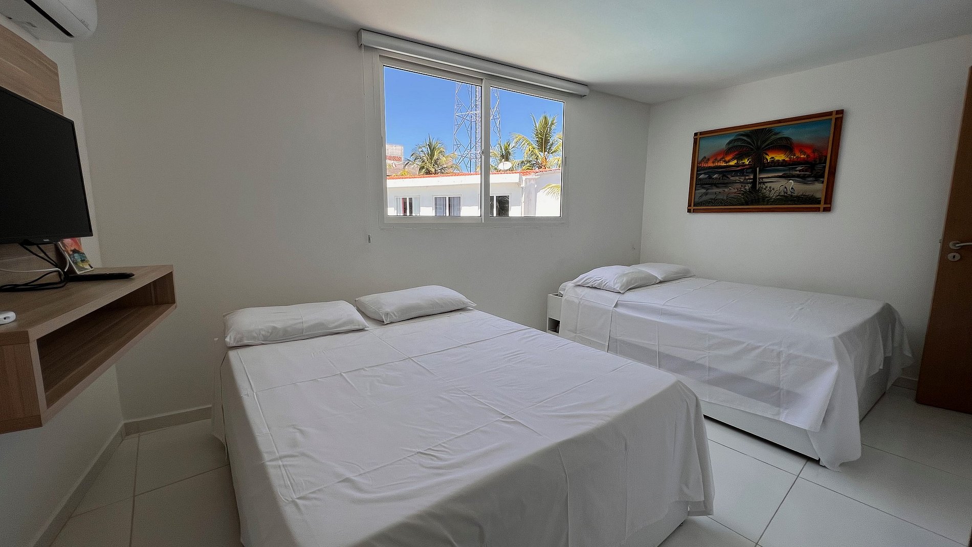 - 01 quarto com: ar-condicionado, 3 camas de solteiro + 1 cama casal, armário e TV.