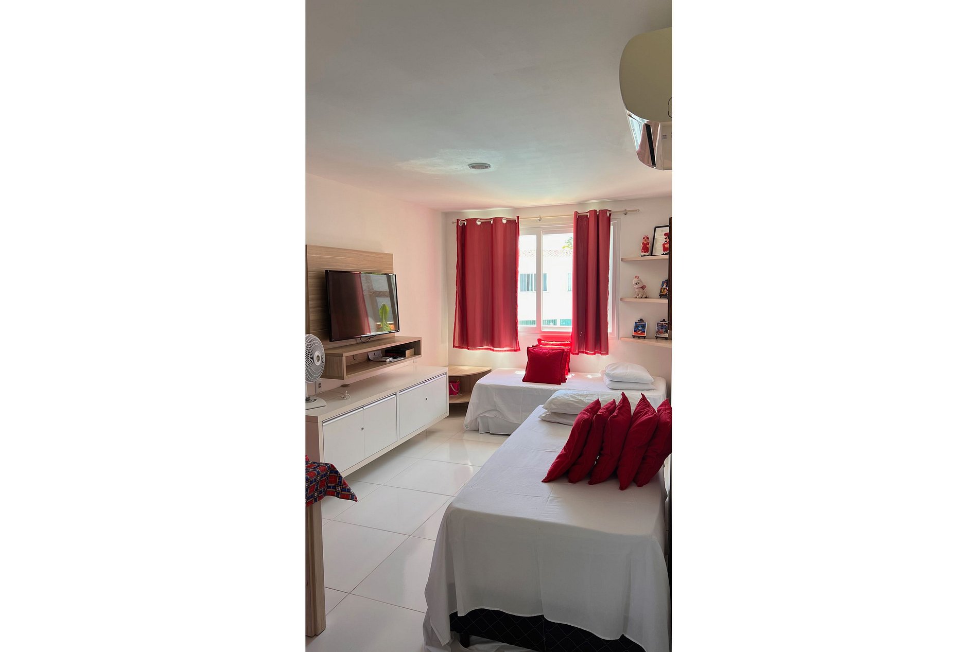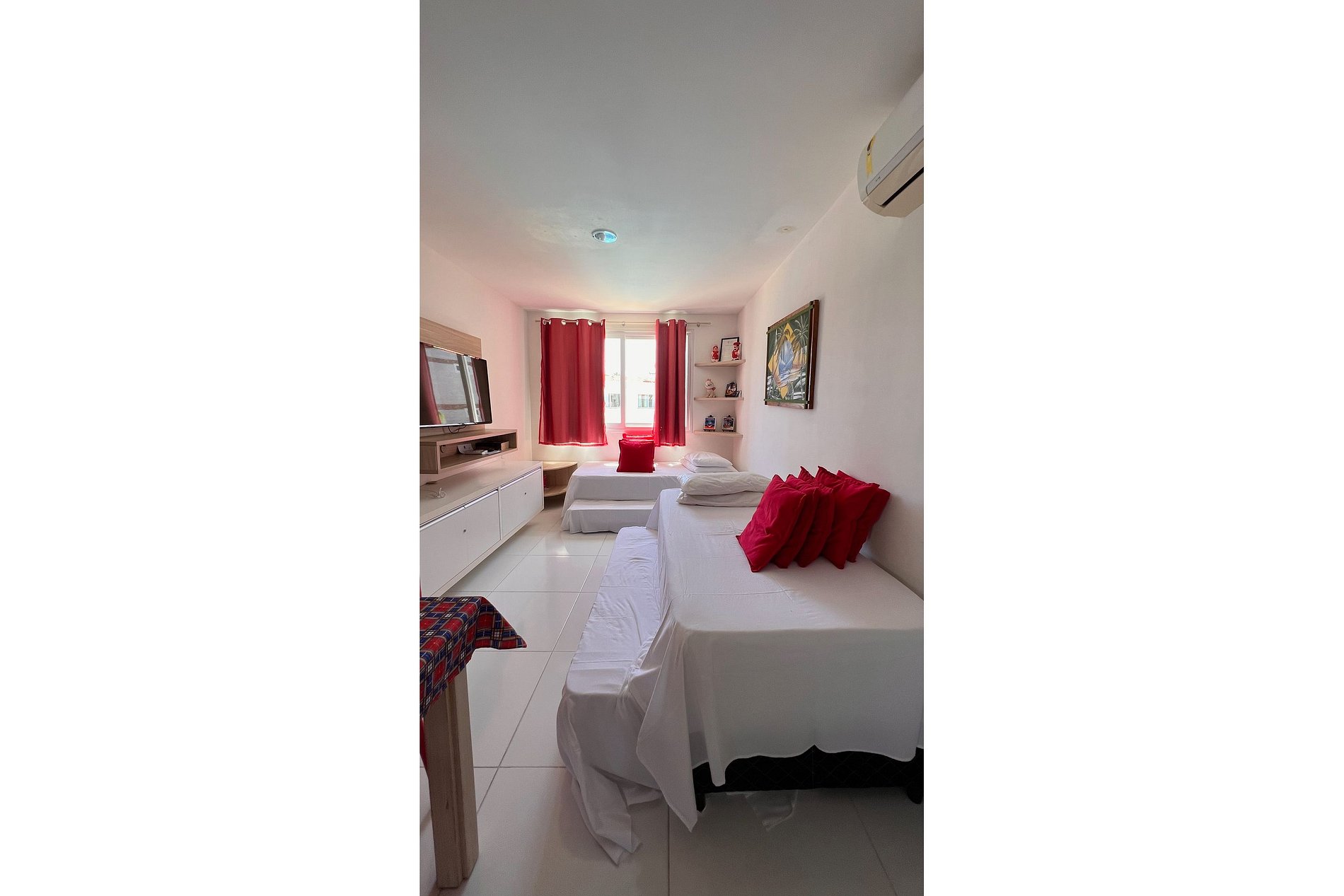 - 01 sala com: ar-condicionado, 2 camas de solteiro + 2 camas auxiliares, armário.