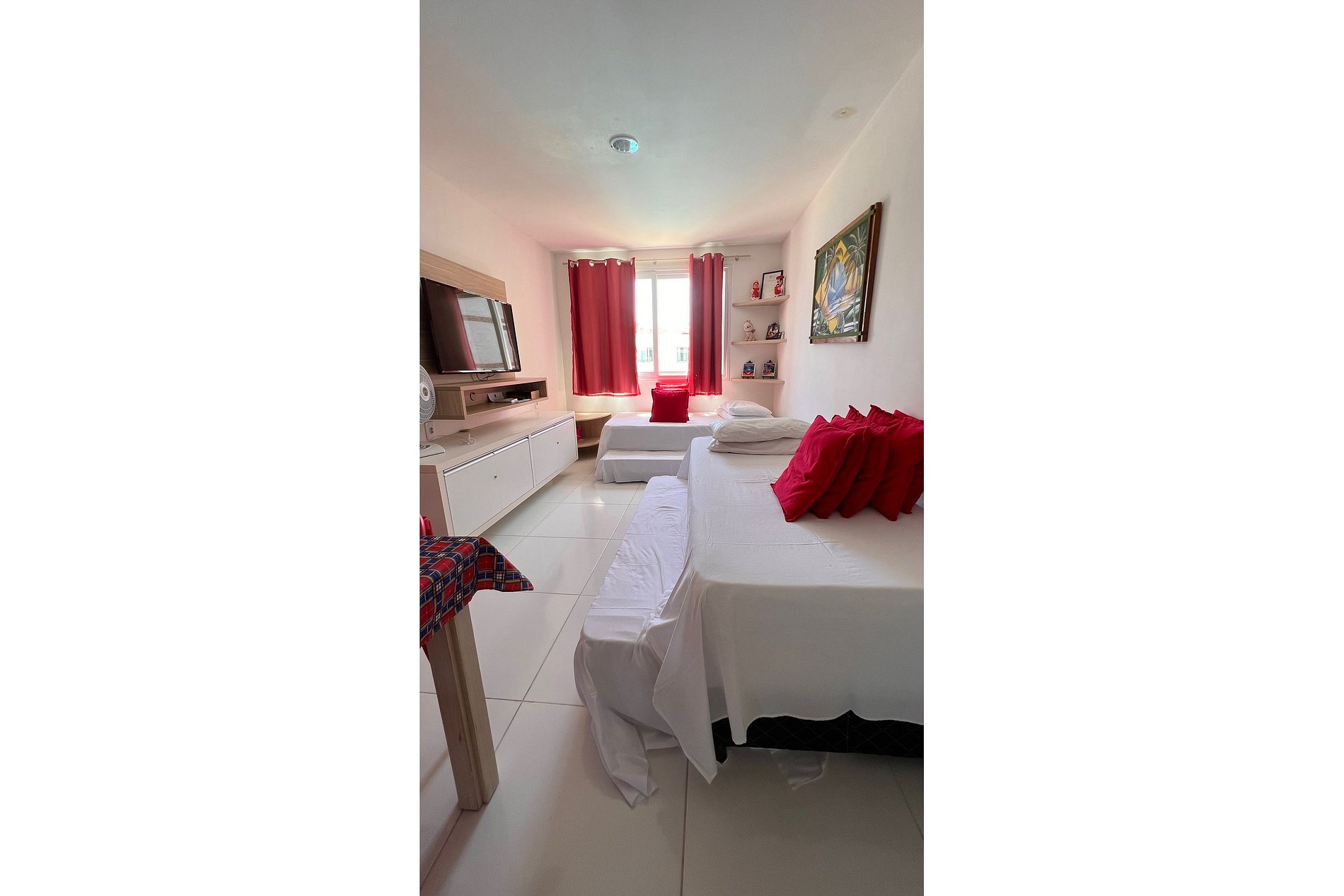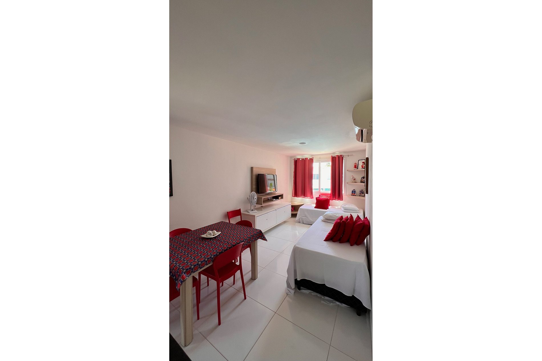 Apartamento conta com: sala de estar com TV, duas camas de solteiro + duas camas auxiliares, ventilador e ar-condicionado; cozinha completa com eletrodomésticos (cafeteira, micro-ondas, jogo de panelas, geladeira, etc.); banheiro individual.