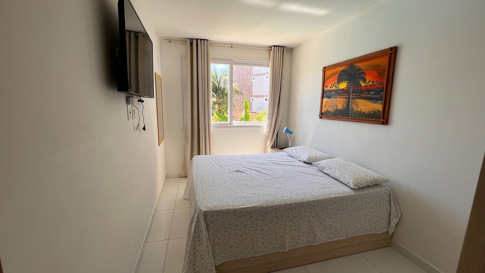 - 01 quarto com: ar-condicionado, 01 cama de casal, um armário e uma TV