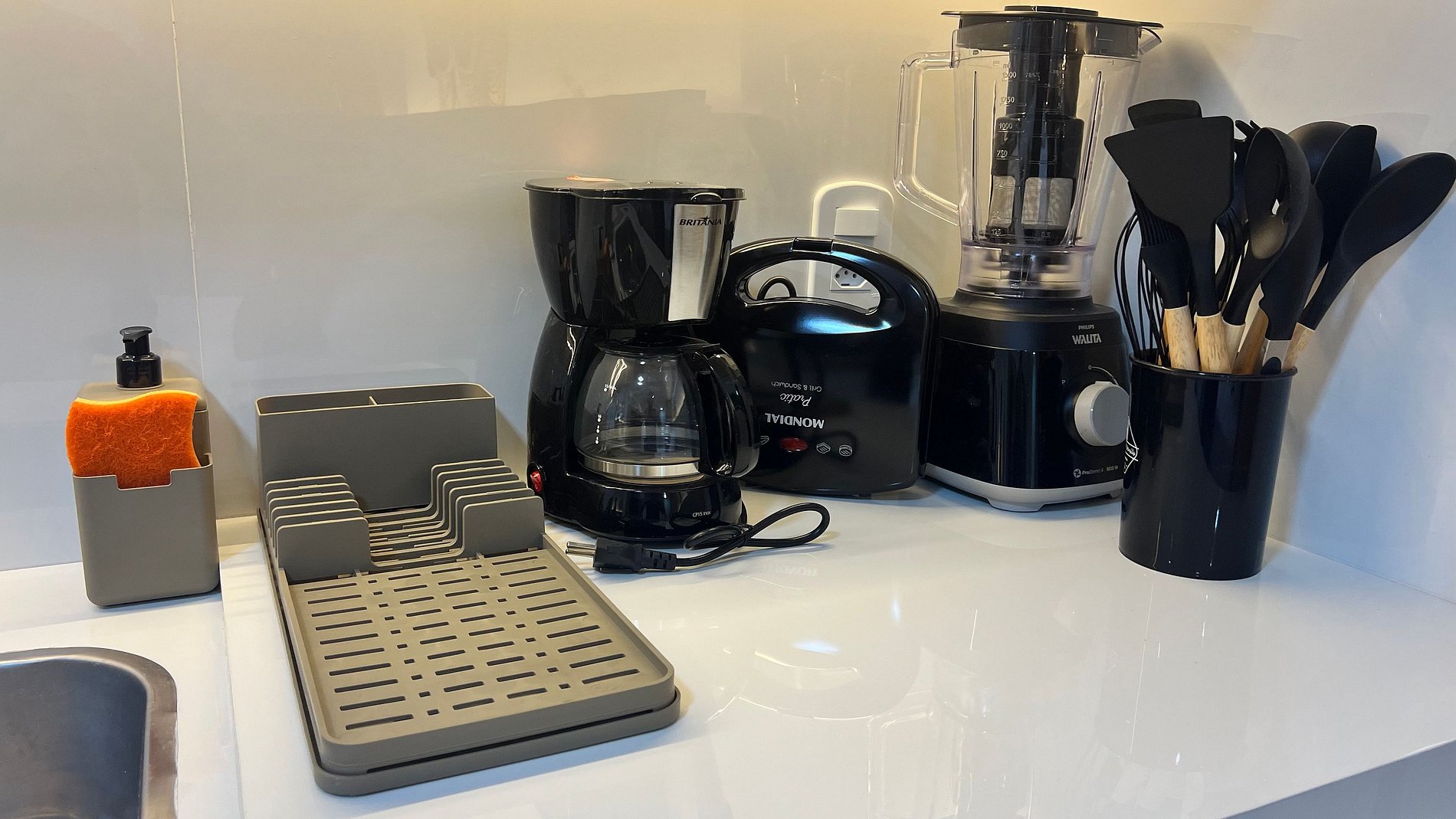Sugestão: ganchinho para pendurar o pano de prato, deixar um paninho para secar a pia e alguns itens básicos, como sal e açúcar.