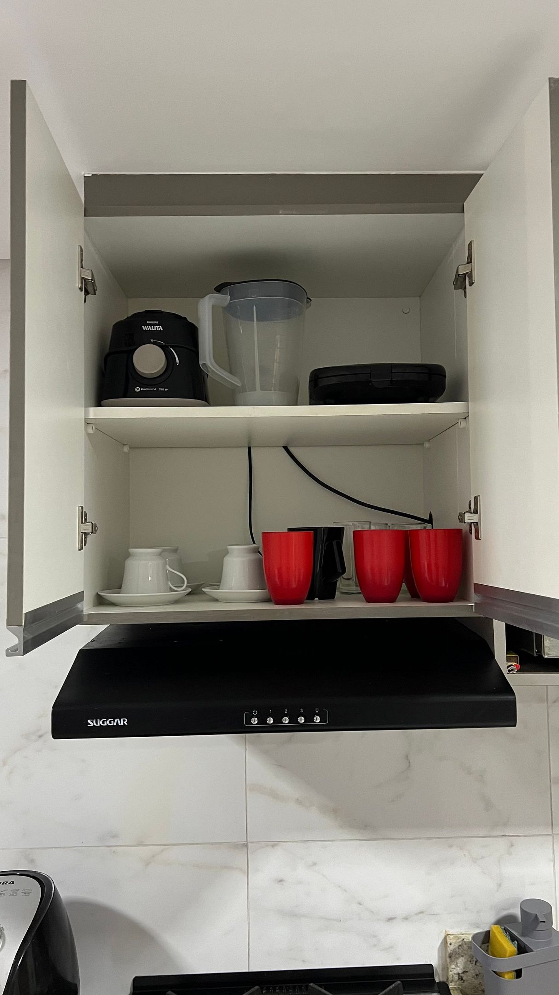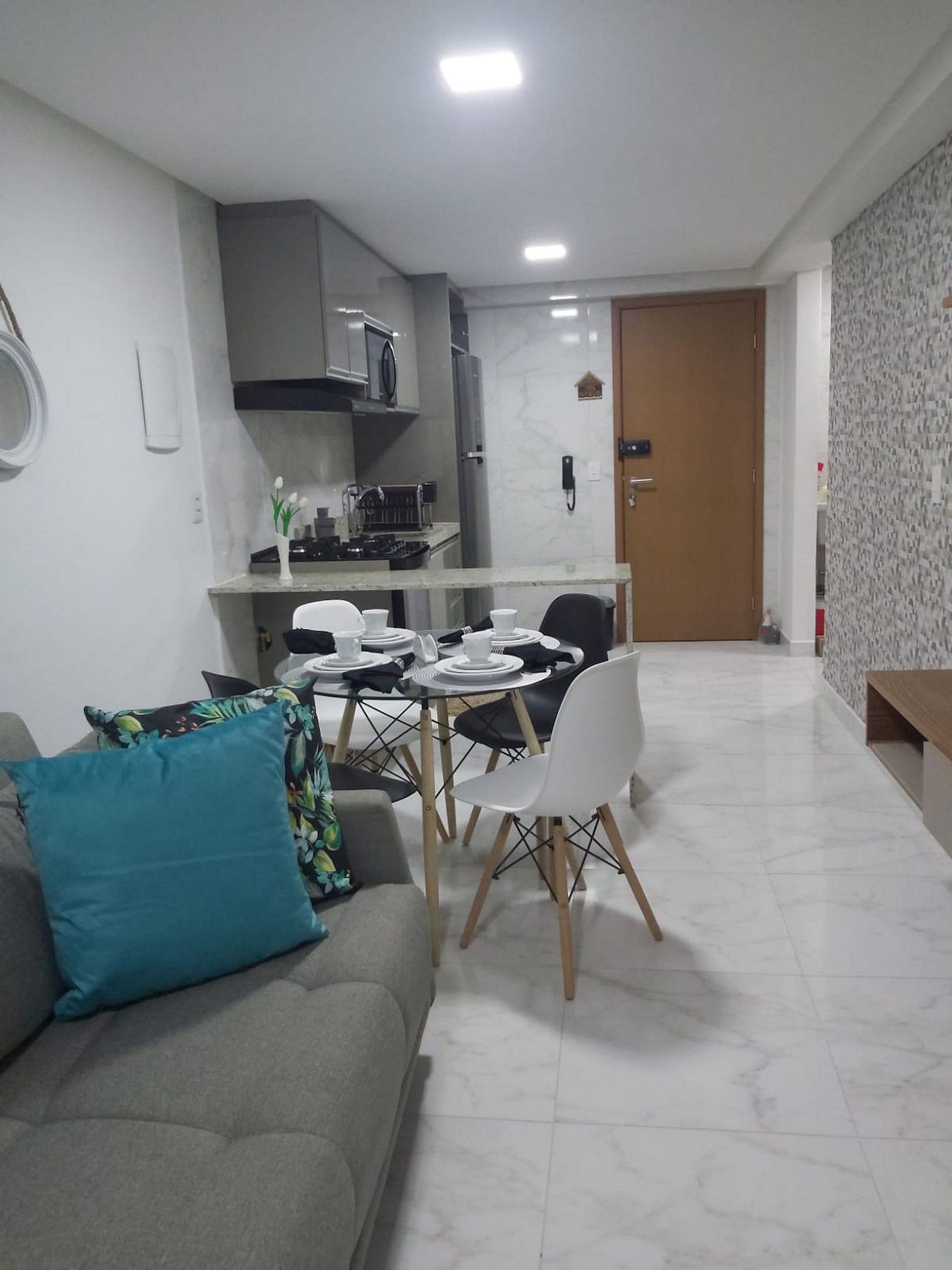 Apartamento conta com: sala de estar com TV, sofá-cama,, ventilador e ar-condicionado; cozinha completa com eletrodomésticos (cafeteira, micro-ondas, jogo de panelas, geladeira, etc.); banheiro individual.