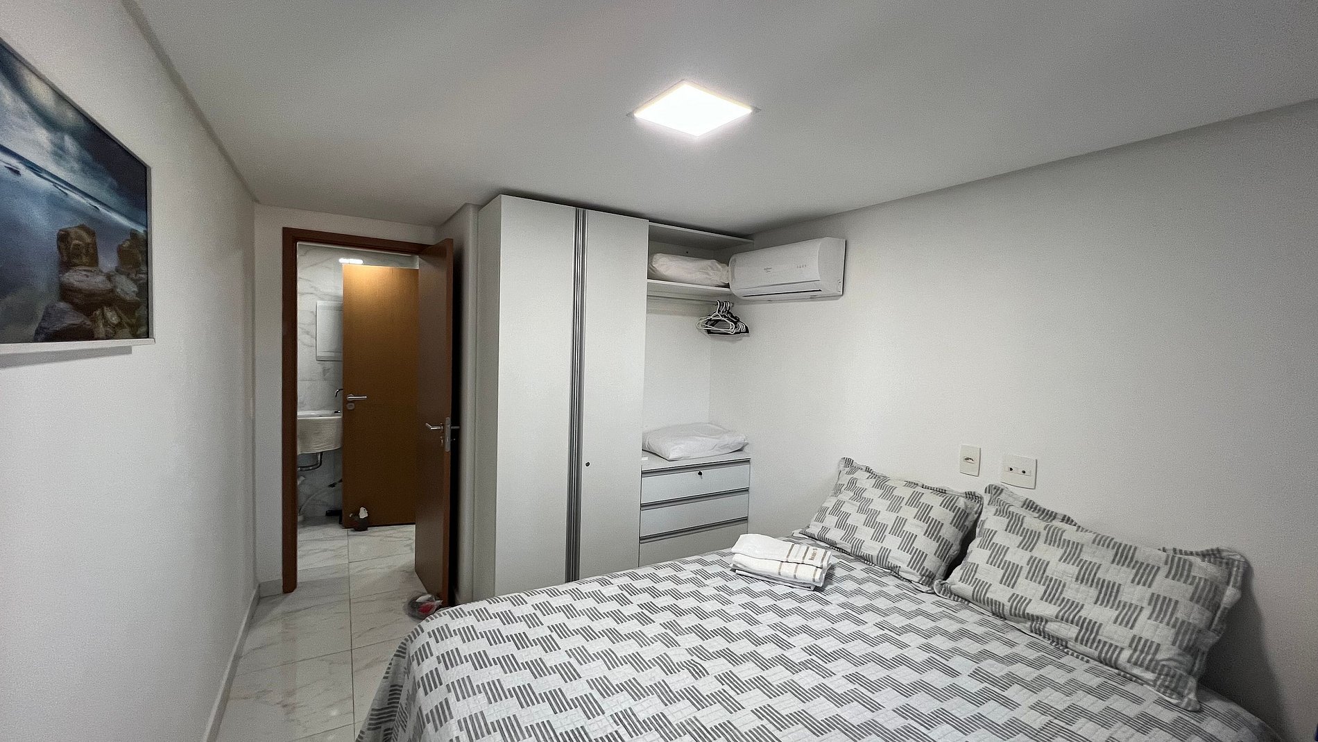 - 01 quarto com: ar-condicionado, 01 cama de casal, um armário e uma TV